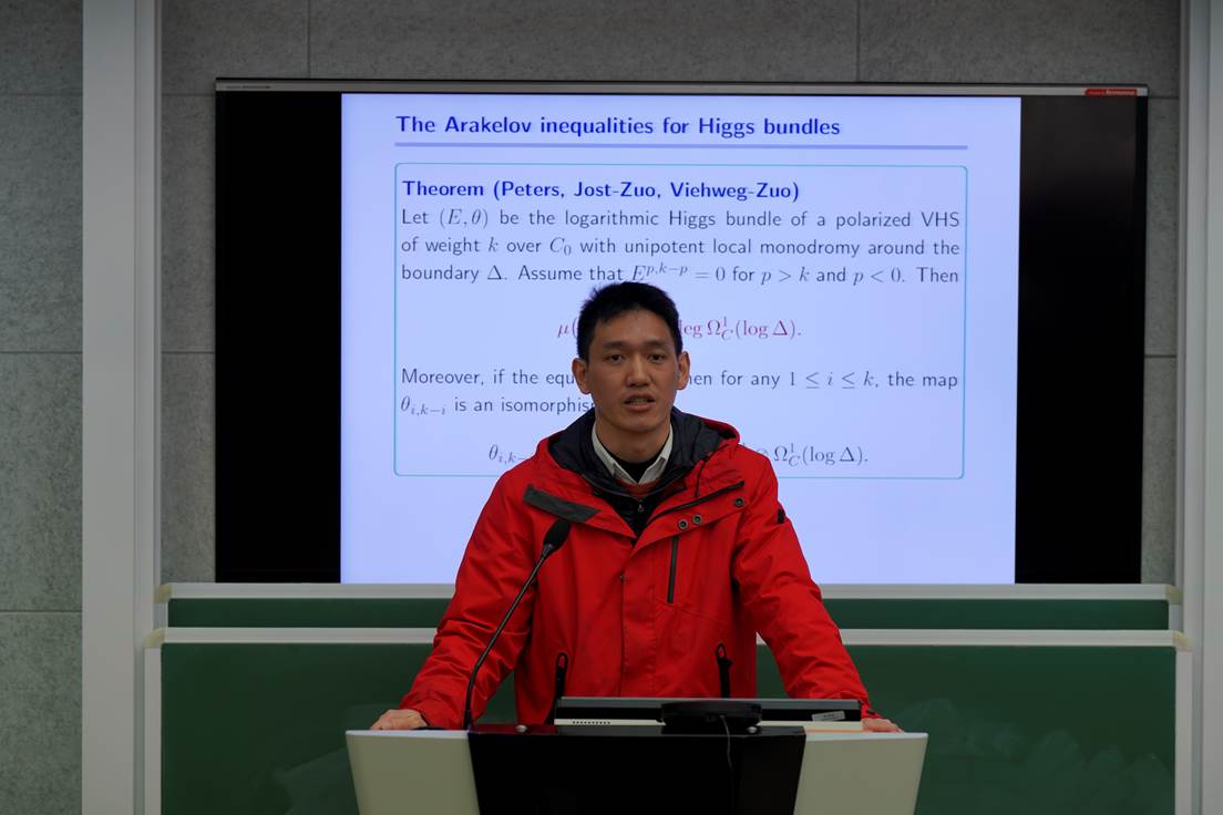 吕鑫教授作报告“Strict Arakelov inequalities for a semi-stable fibration”