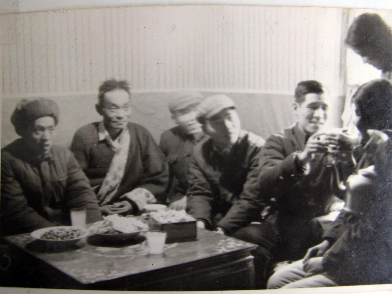 我们应邀在藏族老师次旦卓嘎家中作客,藏族老师向我们敬青稞酒。其中左1是复旦大学的华宣积,左3是交通大学的张汉正,左4是王仁义,正在接酒的是徐剑清。