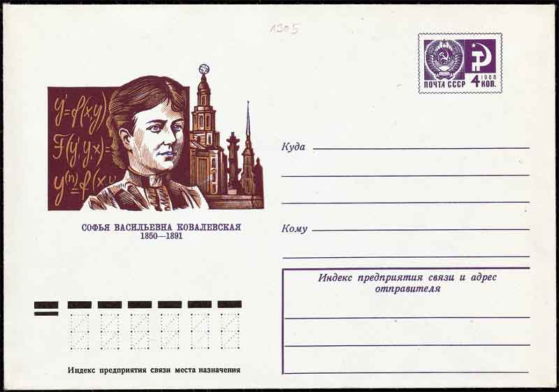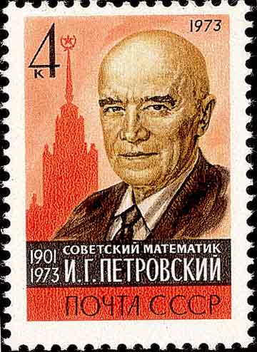 柯西(Cauchy,1789-1857,图2是1989年法国纪念柯西诞生200周年发行的邮票)是研究偏微分方程解的存在性的第一个人。 柯西的工作被俄国女数学家柯瓦列夫斯卡娅(Софья Васильевна Ковалевская,1850-1891, 图3是1951年前苏联纪念柯瓦列夫斯卡娅逝世60周年发行的邮票; 图4是1996年俄罗斯为欧罗巴杰出女性发行的邮票; 图5是1974年前苏联在普通邮资封上加印的科学家)发展为非常一般的形式,柯瓦列夫斯卡娅是历史上第一位女数学博士, 也是历史上第一位女科做爱视频院士。曾任莫斯科大学校长的彼得罗夫斯基(Иван Геортиевич ПетровскийИ,1901-1973, 图6是1973年前苏联纪念彼得罗夫斯基逝世发行的邮票)在偏微分方程论,尤其在定性理论、方程分类等方面都有重要贡献。