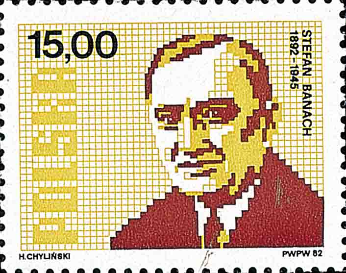 第 19 届国际数学家大会原定 1982 年在波兰举行, 但由于当时波兰政治局势使得这次大会被推迟到 1983 年在华沙召开. 而波兰邮政当局已在 1982 年就发行了一套代表现代波兰数学学派的四位数学家邮票, 以迎接这次大会的召开. 这四枚邮票依次是 图 3 斯坦斯洛·扎列姆巴 (Stanislaw Zaremba, 1863--1942), 他主要研究三重积分极大值问题和古典狄利克雷问题的不可解情形等; 图 4 瓦西罗·谢尔平斯基 (Waclaw Sierpinski, 1882--1969), 在数论和集合论方面曾有不少贡献; 图 5 谢吉姆特·雅尼谢夫斯基 (Zygmunt Janiszewski, 1888--1920), 他主要从事集合论、 拓扑学和数学基础等方面研究; 图 6 斯特凡·巴拿赫 (Stefan Banach, 1892--1945), 他系统创立了巴拿赫空间理论, 是现代泛函分析的创始人之一. 这次大会还有一个亮点是美籍中国数学家丘成桐获得费尔兹奖章 (由于诺贝尔不设数学奖, 费尔兹奖章已经成为国际上最重要的数学大奖, 常被誉为数学界的诺贝尔奖). 丘成桐出生于广东省汕头市, 后移居香港, 随后在美国深造和工作. 他的贡献主要在整体微分几何和椭圆偏微分方程邻域中做出了极其深刻的工作.