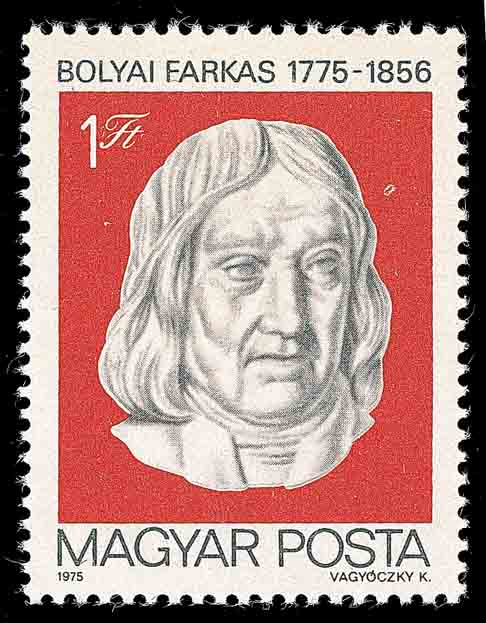 这时匈牙利青年数学家鲍耶·雅诺什 (Bolyai Janos, 1802-1860, 图 2 和图 3 分别是匈牙利和罗马尼亚在 1960 年为纪念鲍耶·雅诺什逝世 100 周年发行的邮票) 虽然遭到父亲 — 数学家鲍耶·法尔斯 (Bolyai Farkas, 1776-1856, 图 4 是匈牙利 1975 年发行的纪念鲍耶·法尔斯诞生 200 周年邮票) 的反对, 仍然致力于第五公设的研究, 终于发现了第五公设不可证明和非欧几里得几何学的存在, 并在 1823 年写成论文《空间的绝对科学》. 鲍耶·法尔斯将它寄给他的好朋友高斯, 希望得到他的赞许并公诸于世. 但高斯在赞扬雅诺什勇于探索精神的同时, 还说这与我 30 年前的工作不谋而合. 我无法夸奖他, 因为夸奖他就等于夸奖我自己. 这使鲍耶·雅诺什极为失望, 一直到 1832 年才在他的父亲的一本著作里, 以附录的形式发表这个研究成果. 但当他于 1840 年看到罗巴切夫斯基论文的德文版后就更加灰心丧气了.