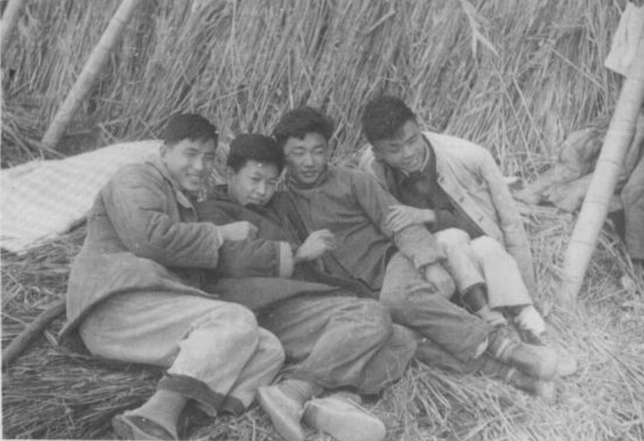 乐观 这是难能可贵的照片:戴德元、黄良汉、姜宗信、张有源 — 年轻,乐观。此照片能唤醒我们对崇明围垦,住草房、睡芦柴的回忆。