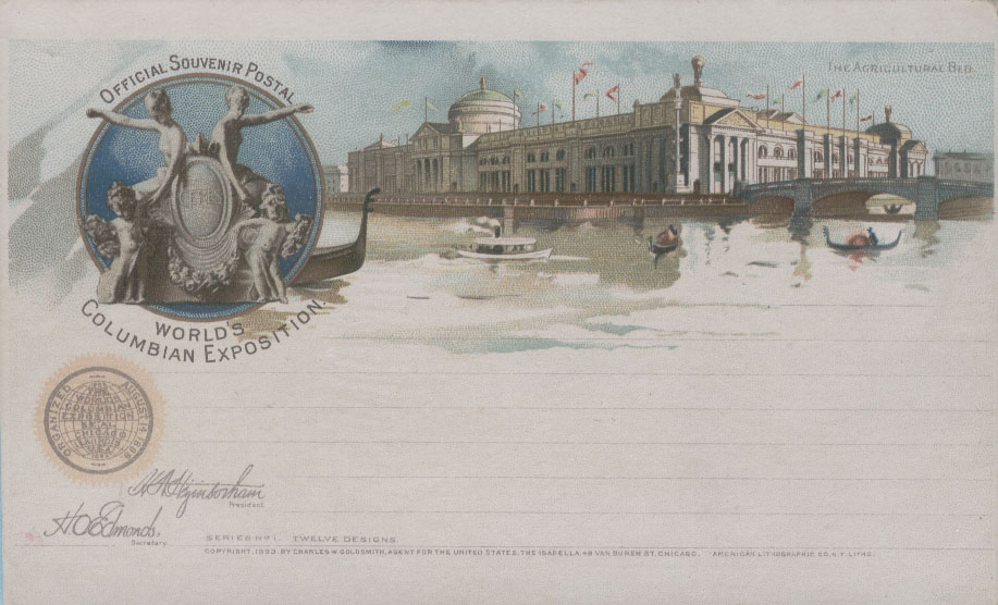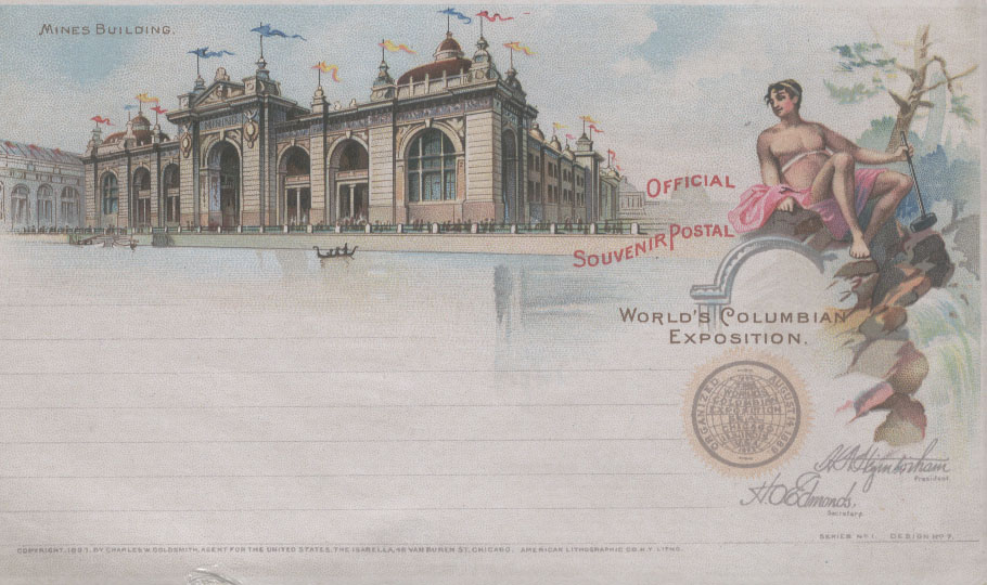 为扩大世博会的影响,美国邮局当局利用1891年发行的邮资明信片为载体加印了一套精美的世博会明信片,除了上述图2以外,其他明信片主要介绍园区内的场馆,如: