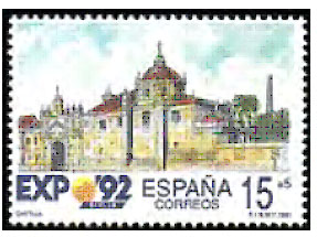 1992年2月28日发行一张《塞维利亚世界博览会》纪念邮票,画面为西班牙亭阁(图22)。