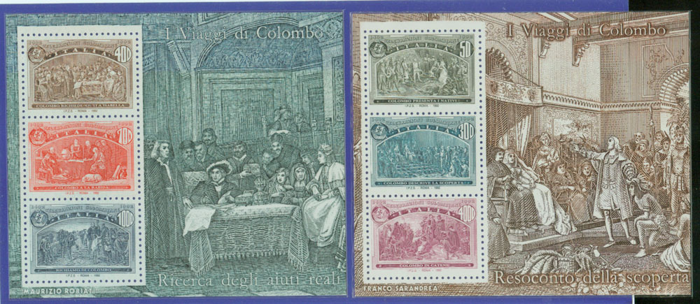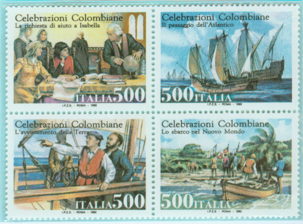 1992年5月22日西班牙与美国、葡萄牙、意大利等四国又同时联合发行同图6枚纪念小型张。 下面图27是意大利的那一套(四套中意大利这一套目前价格最高,约35美元)。