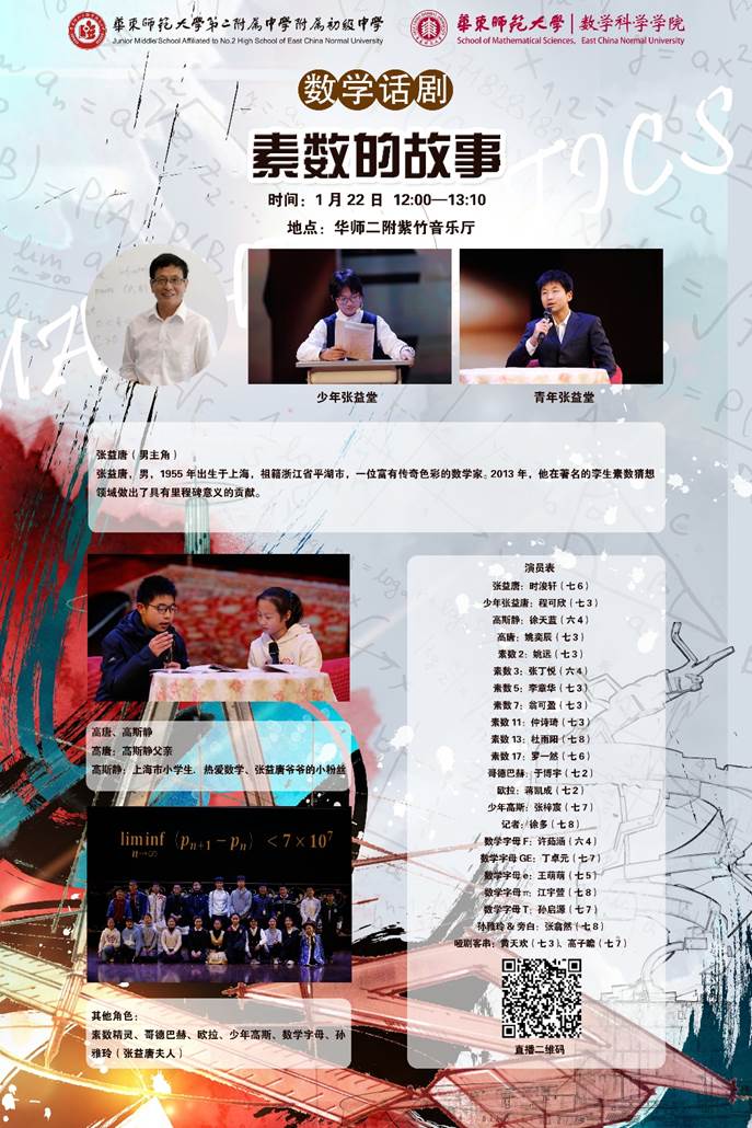 原创数学话剧《素数的故事》以张益唐先生的数学传奇人生为主线,讲述和呈现了素数星空下的七彩故事。这里收藏的是2021年1月22日的这一数学话剧的直播回放视频。本次活动由做爱视频 与华东师大二附中附属初中联合主办。